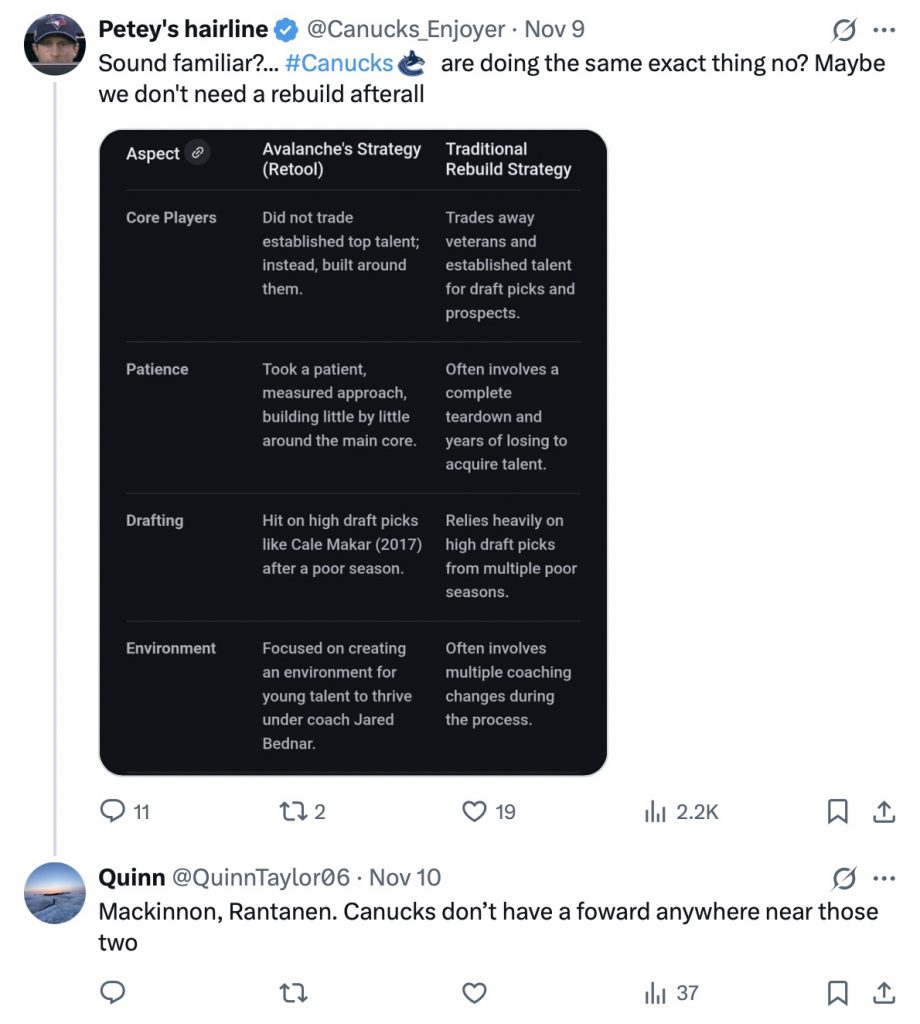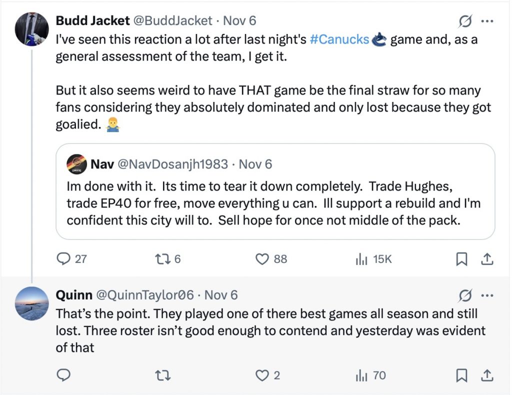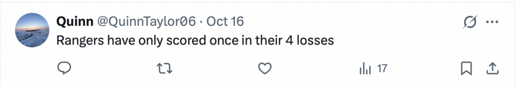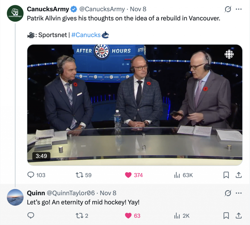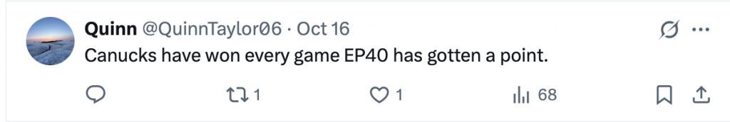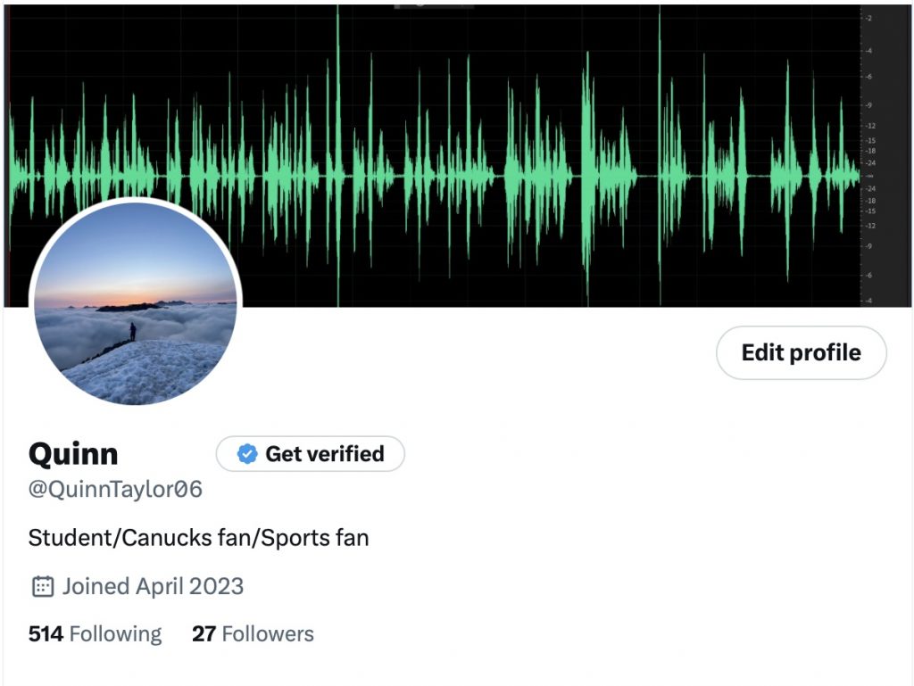 Since September Quinn has become an active member on X, commonly tweeting subjects surrounding the Vancouver Canucks as well as other sports stories. Since Quinn joined in September he has gained 27 new followers. He has posted over 50 times with his most successful post having 63 likes. Quinn hopes to continue tweeting and growing his personal social media footprint.